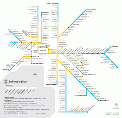 The new PTV map really throws the geography out the window to the extent that it becomes less useful. For example, the Mernda line goes pretty much directly north-south between Lalor and West Richmond, as does the Upfield line between Upfield and Jewell - and in fact they parallel each other quite close together for much of that distance. If you're heading into Melbourne's north, there's a good chance that your destination lies between these two lines - so, for example, if one line is down because of a track fault, you might be best to take the other one and catch an east-west bus across to your destination. Similarly, there is quite a big gap between the Hurstbridge and Lilydale lines, where the Yarra river runs (and where Doncaster is wholly reliant on buses), but you wouldn't know it to look at this map - it makes them look very close together.